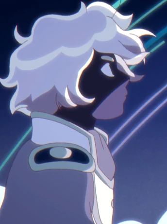 For attire, he wears a white coat with a high collar, epaulets, and elbow patches, along with a galaxy cape, boots, and trousers. His clothes overall have periwinkle embroidery.