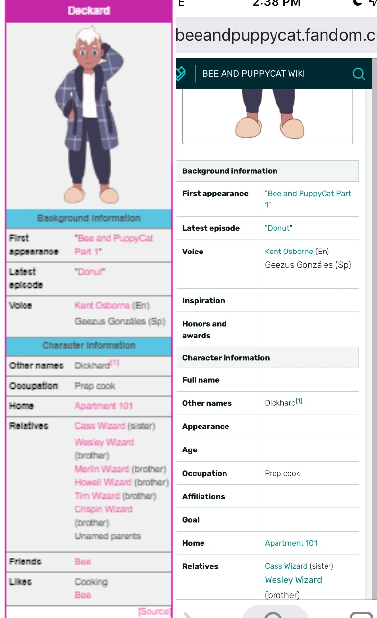 On web the infoboxes look fine, but on mobile the infoboxes, especially the ones for characters, show every single thing on there, so on web if there is parts of the infoboxes with no information filled in, they do not appear at all, but on mobile everypart of the infobox appears whether or not it has info in it. This makes the info boxes look long and empty on mobile.